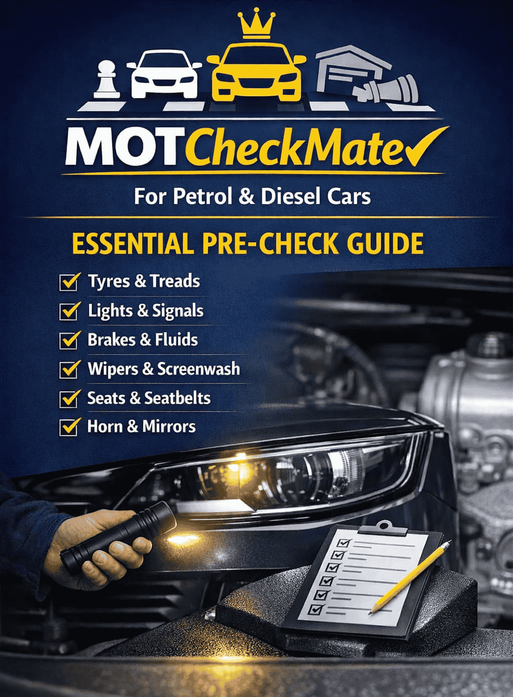MOT CheckMate is a practical, easy‑to‑follow pre‑MOT guide designed to save drivers time, money, and stress. Built around a clear 10‑Step System, it shows you exactly how to check the areas that cause the majority of MOT fails — from tyres and lights to brakes, fluids, suspension, emissions, and more. As the guide explains, “most MOT issues aren’t complicated faults; they’re small, preventable problems that go unnoticed until test day.”